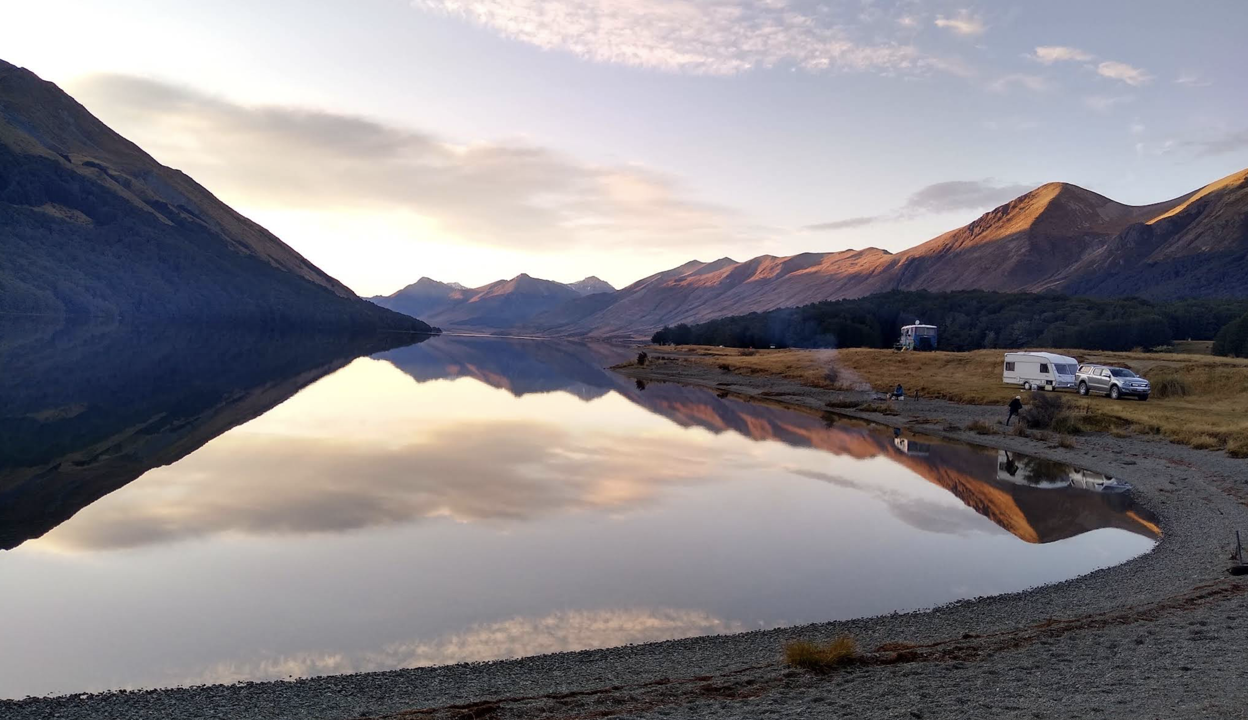 Two lakes—North Mavora and South Mavora—connected by walking tracks through beech forest. The camping area is huge and informal, spreading across grassy clearings with lake access. Fishing is excellent. Swimming is cold but refreshing. The scenery is absurdly good.